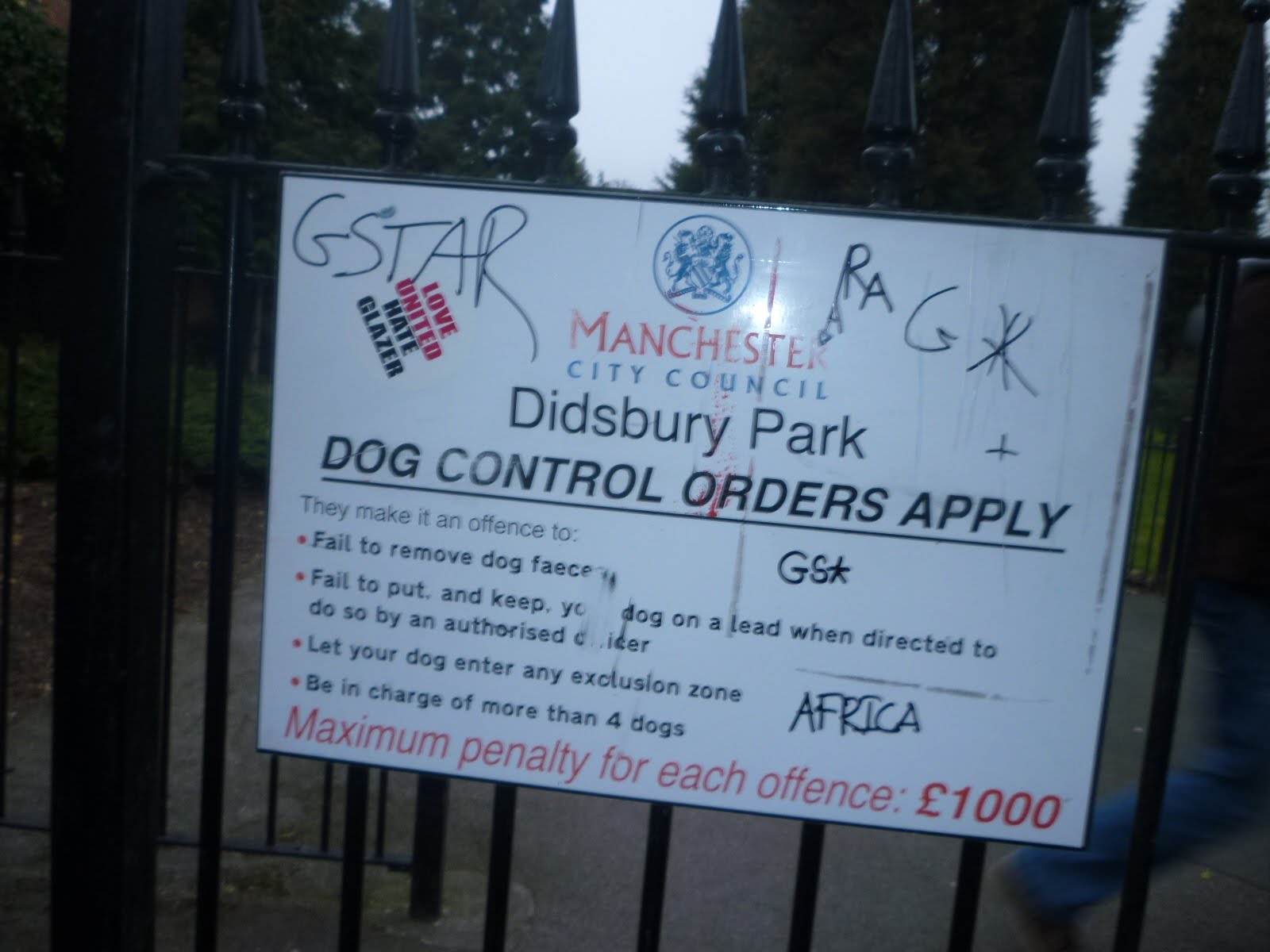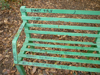 Graffiti in Didsbury Park, including the veterans hut and the bowling hut