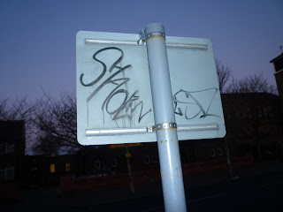 Telegraph pole tagged outside flats on Wilmslow Rd |