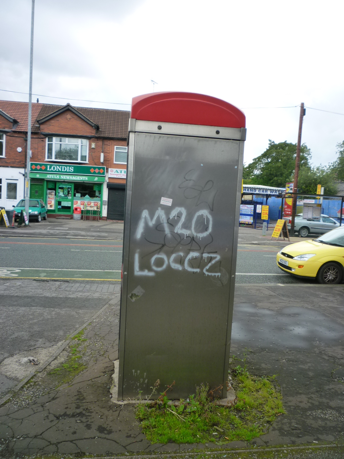 | Wilmslow Rd phone box graffiti outside Noddy's kebab shop |